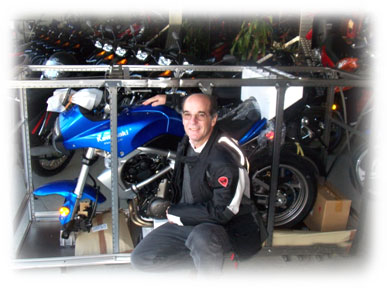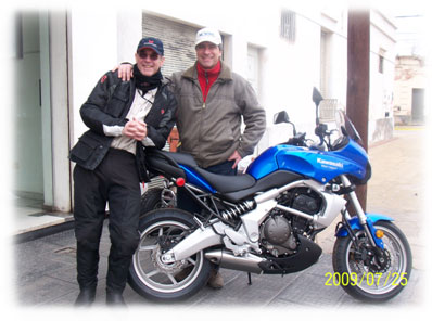 También el viernes llegó el certificado de importación a Lobos. Así que el sábado nos fuimos con mi hijo Arcadio a buscar la moto. Fuimos, instalamos el GPS, me saqué foto con mi amigo Ignacio Giache y nos volvimos para Buenos Aires. Ahora sólo tengo que ablandarla y llevársela de nuevo a Ignacio para que la embale y la mande a Ezeiza. Si bien no puedo pasar todavía las 4.000 RPM, se nota que la moto es muy salidora de abajo. Como toda trailera copia bien los caminos rotos y es extraordinariamente cómoda. La verdad, creo que hice una muy buena elección. Ya siento que no falta nada y que me estoy yendo en pocos días, y no puedo creerlo! Todas las piezas comienzan a encastrarse como en un rompecabezas bien cortado, no quiero adelantarme porque sé que eso es yeta, pero me tengo una fe bárbara. La seguimos en la próxima. |